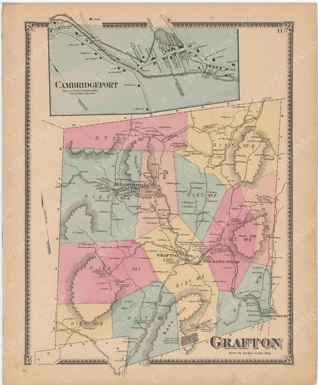 Early New England towns often have named sections because of the way they developed socially, geographically, and economically in the 1600s–1800s. These names weren’t just decorative—they usually had a very practical function in identifying where people lived or worked. In our town of Grafton, Vermont (Windham County), we have the recognized historic districts of Grafton Village (the Lower Village), Houghtonville, Mechanicsville, and Middletown Rural (Middletown Hill), as well as a section of early settlements, now seen as cellar holes, known to locals as Howeville. And while state records put Cambridgeport officially in the Town of Rockingham, Grafton’s ties to this hamlet are so old and so strong that we hope Rockingham won’t mind sharing Cambbridgeport history with us as part of the Grafton family.